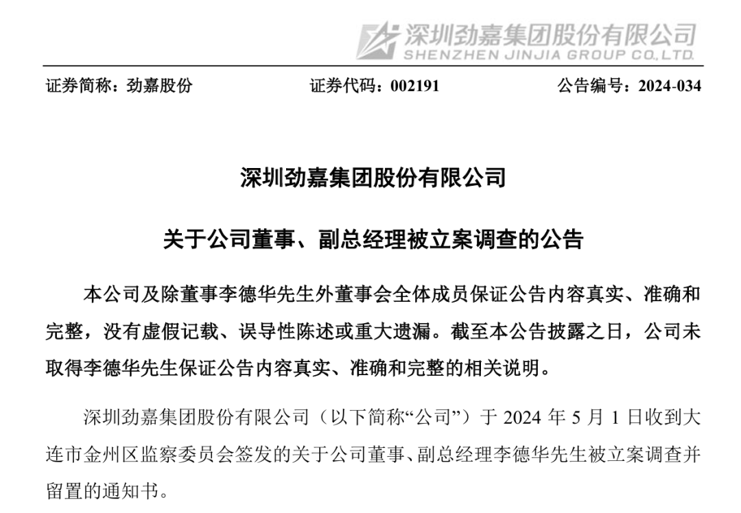 5月5日,劲嘉股份(维权)(002191.SZ)公告,公司于5月1日收到大连市金州区监察委员会签发的对于公司董事、副总司理李德华被立案走访并留置的告知书。本次立案走访事项不会对公司的日常运营变成紧要影响,公司各项出产操办活动平日进行。规摹本公告败露日,公司尚未明察本次立案走访事项的进展及论断。