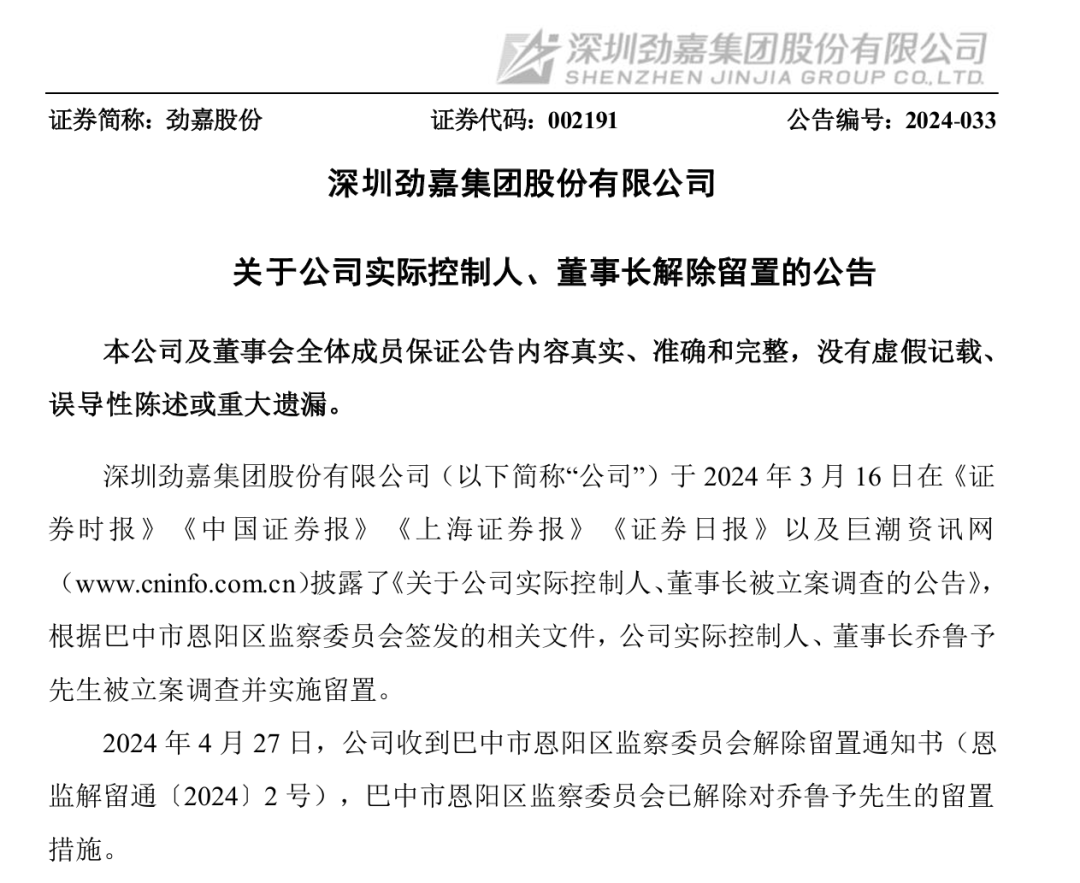 值得谛视的是,4月28日晚间,劲嘉股份败露公告称,4月27日,公司收到巴中市恩阳区监察委员会排除留置告知书,巴中市恩阳区监察委员会已排除对公司骨子抑止东说念主、董事长乔鲁予的留置标准。